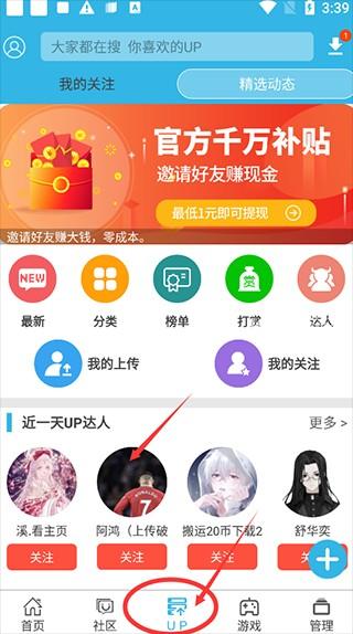 1. 打开后,在进入的主页面中选择“up”功能按钮,接着点击进入,找到达人排行,挑选图中所示的达人。