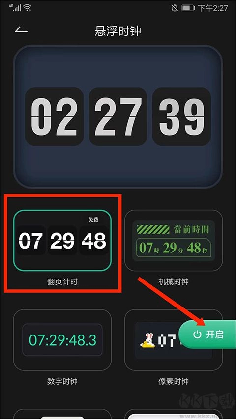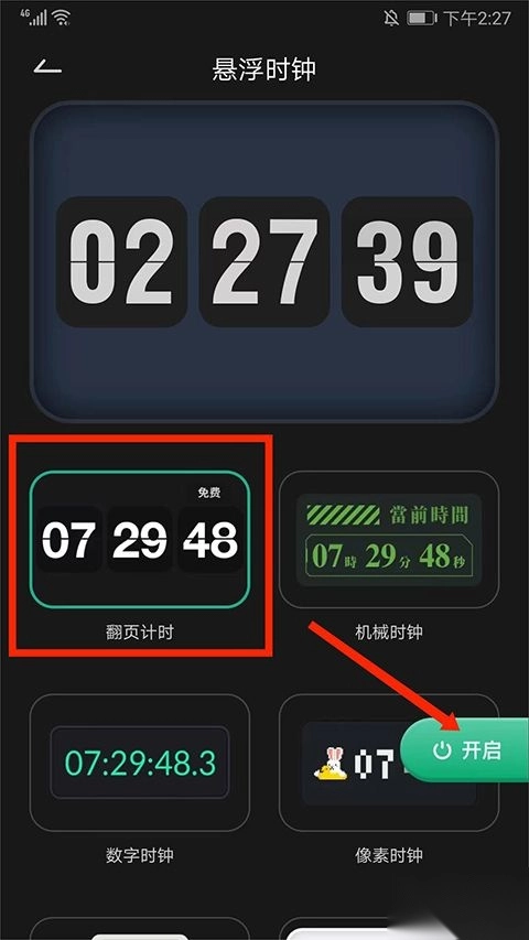 3、开启时钟样式:在【悬浮时钟】界面选择喜欢的样式,如【翻页时钟】,点击【开启】按钮。
