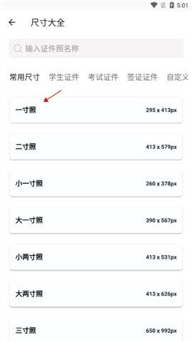 2、随后挑选所需尺寸的照片,这里我以一寸照作为示例。