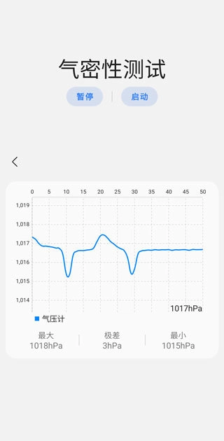 1. 气密性测试:具备暂停/启动功能(便于截图),能够自动计算极差,并显示最大/最小压力。可通过主页上方的图标,或者从关于手机界面右上角进入该测试。