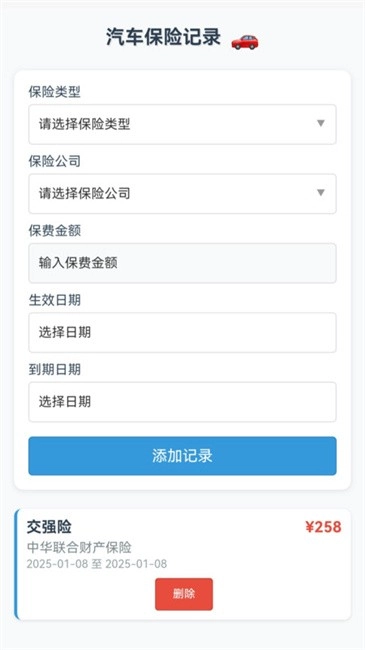 能够便捷地记录与管理汽车保险相关信息。用户只需挑选保险类型、保险公司,再录入保费金额、生效日期以及到期日期等内容,就能轻松完成保险记录的添加操作。