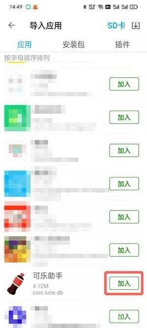 若手机里已安装可乐助手,就从列表里找到并点击【加入】;要是只有安装包,那就通过安装包列表找到加入选项操作。