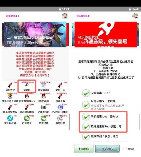 你可以通过点击可乐助手中的【初始化】功能,来查看自己是否已获得root权限授权。
