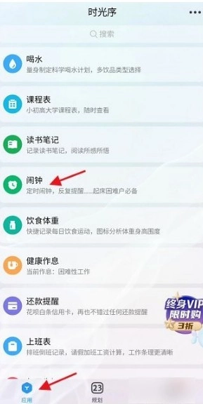 登录后,在软件中找到并点击“闹钟”功能进入。