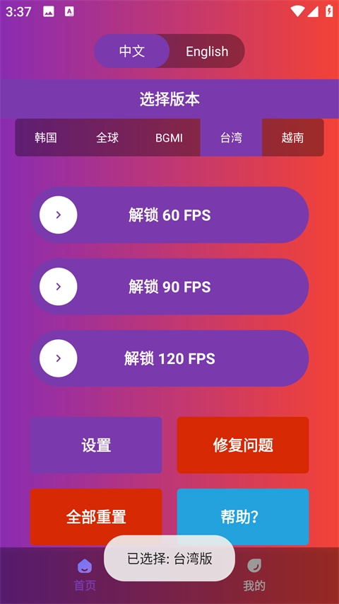 打开90fps画质助手软件后,我们首先点击界面最上方的中文选项来切换语言。