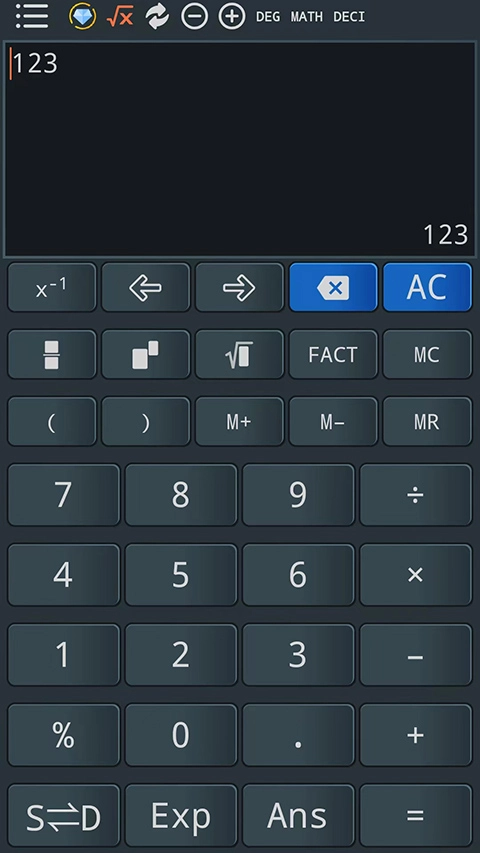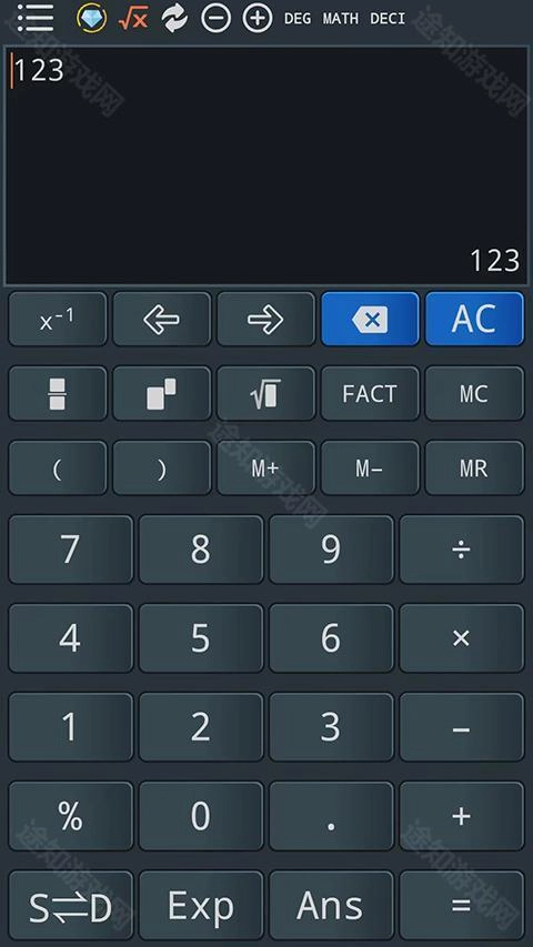 1、用户在本站获取卡西欧计算器应用后,在手机上完成安装并打开该应用,进入计算页面后进行除法运算时,只需按下键盘上的小数/分数切换键(即下图红色方框标注的区域)即可。