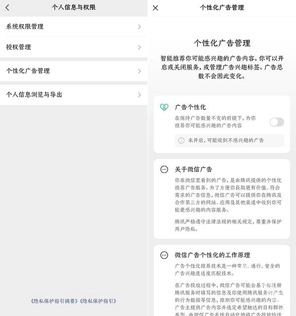 在朋友圈点击广告卡片右上角的「广告」按钮后,弹出的设置界面进行了改版。现在除了能一键关闭当前广告外,还可以快速进入个性化广告设置页面,支持关闭广告个性化推荐功能。不过需要注意的是,这一操作仅能关闭个性化推荐,无法实现永久关闭广告的效果。