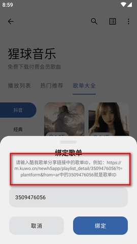2、将酷我分享链接的歌单id复制到软件中点绑定。