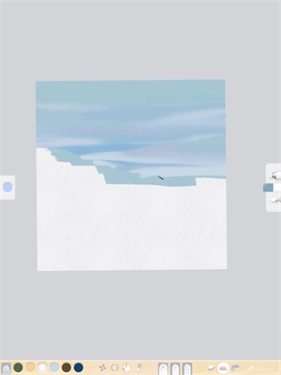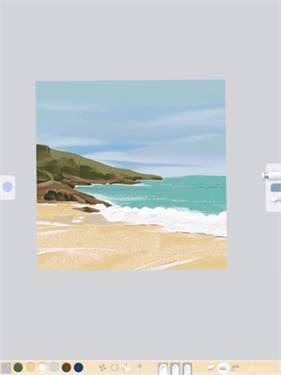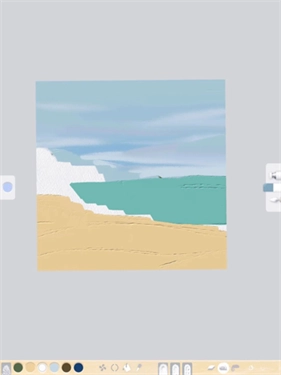 2、用刮刀铺陈大色块,通过吸取颜色来调配深色、浅色或调整色相进行混色;混色时使用油画笔刷,再借助磨平纹理工具完成融合。这种混色方法适用于天空、沙滩等需要自然过渡的场景。