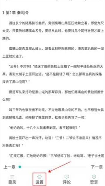 1、首先进入小说阅读界面,点击屏幕页面会弹出目录、设置、评论、赞赏等功能选项。我们从中点击“设置”这一项;