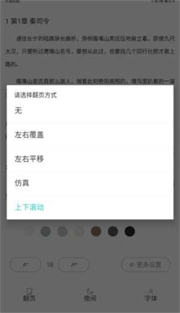 3、最后页面会弹出一个“请选择翻页方式”的选项,其中包含左右覆盖、左右平移、仿真、上下滚动等多种方式,选择你喜欢的即可。
