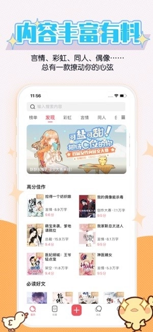 言情、偶像、纯爱、同人,以及仙侠、都市、架空、动漫等题材……上千部原创小说,让你一站式畅享阅读乐趣
