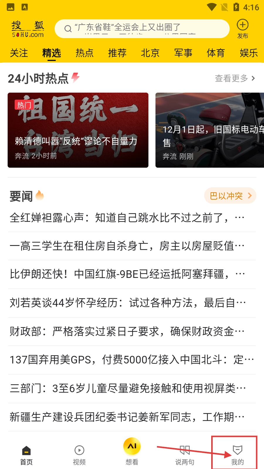 1、打开【搜狐】,进入首页后,可浏览【关注】【精选】等板块的新闻内容,点击右下角【我的】进入个人页面。