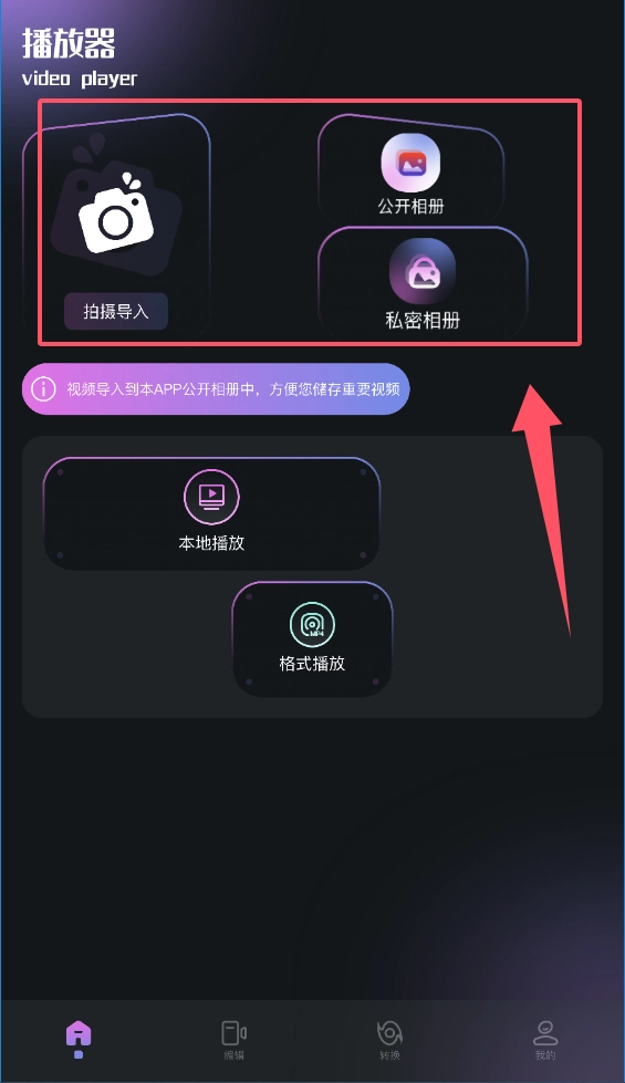 在首页,视频管理是核心功能,用户可通过“拍摄导入”功能获取视频,并将其妥善存储至“公开相册”或“私密相册”中。