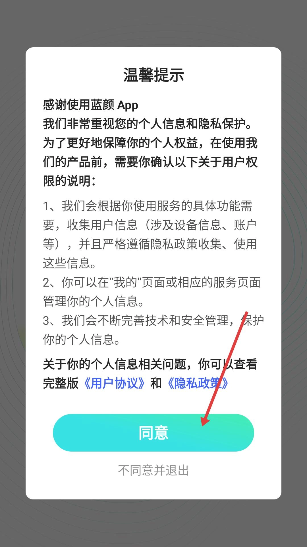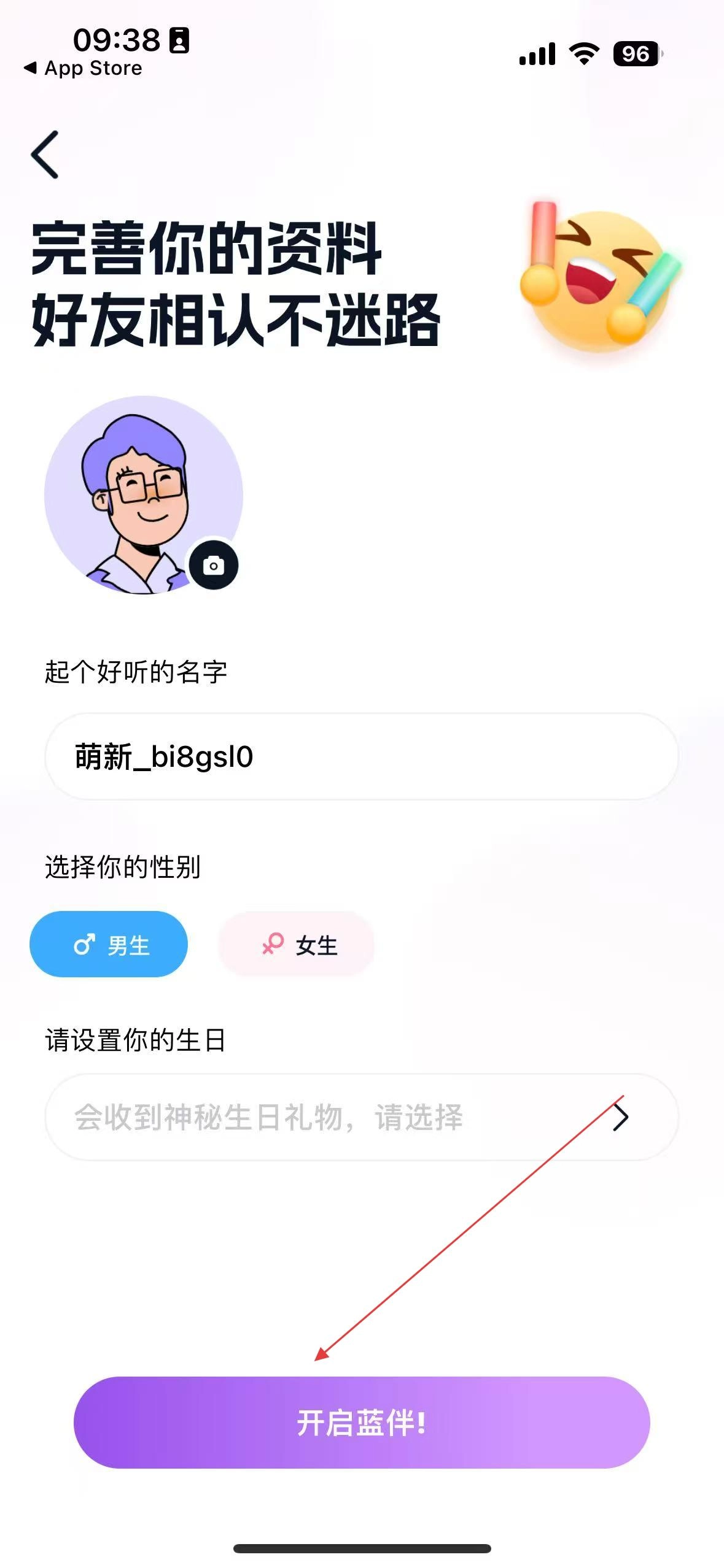 打开蓝颜App,同意相关提示后进入资料页面,完善昵称、性别和生日信息,接着点击开启蓝伴,即可开启社交功能。
