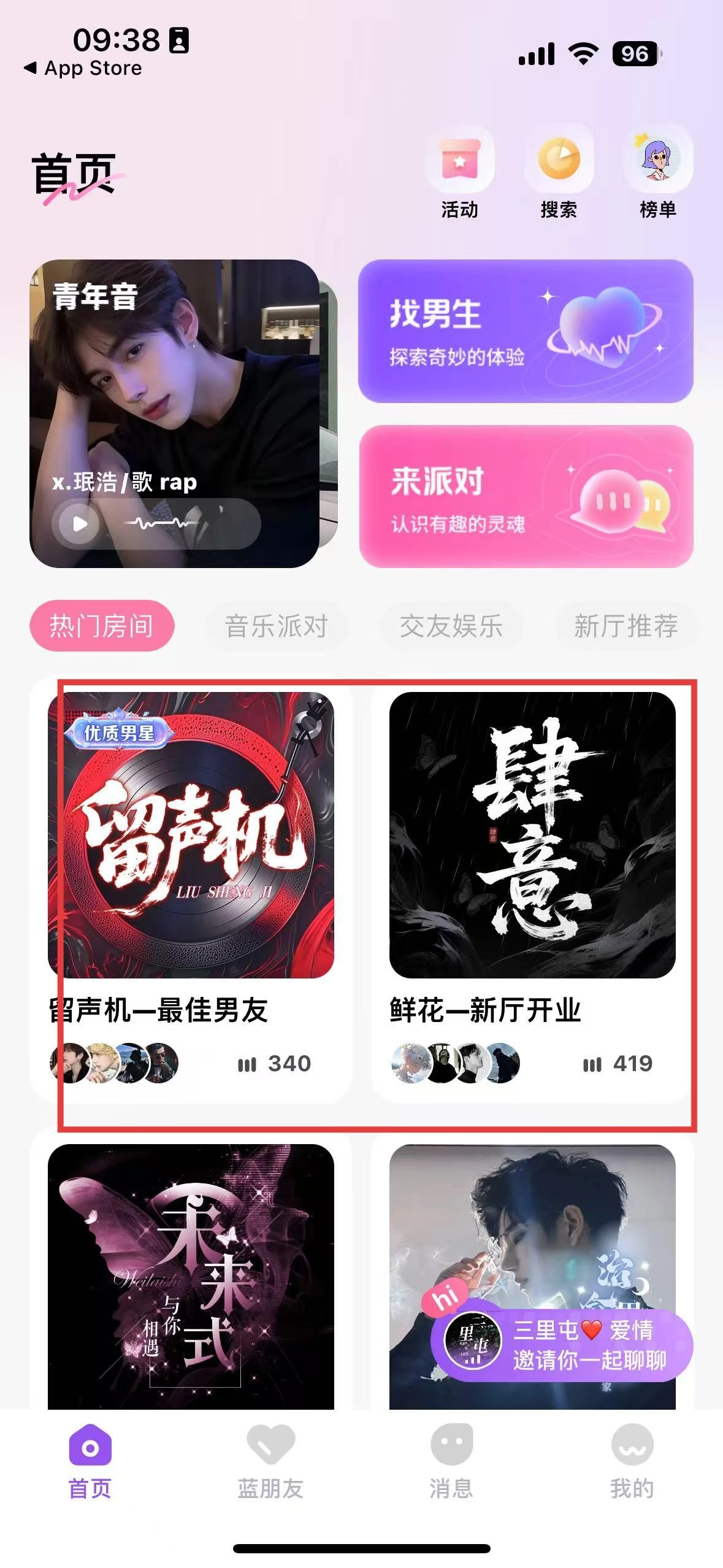 进入首页后,点击热门房间,进入留声机、肆意等厅,进行互动交流,参与音乐派对、交友娱乐活动,拓展社交圈。