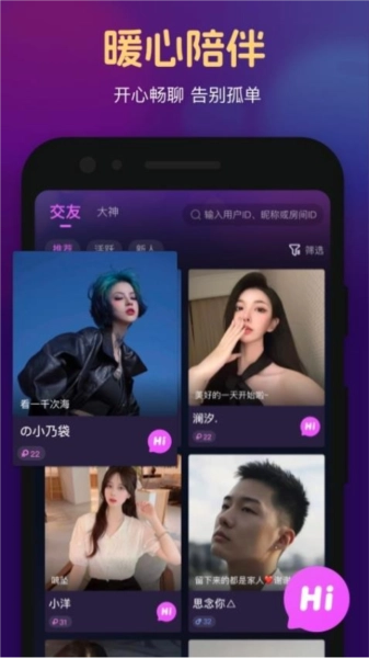 心悦心交友免费版不仅是一个语音社交应用,更是一个温馨的港湾,让人与人之间的联系变得更加紧密。在这里,您可以享受全新的语音缘分配对,体验恋爱沟通的甜蜜;丰富多样的话题和动态让您永不枯燥;独特的社交玩法让您时刻保持新鲜感。无论何时何地,打开心悦心,与心仪的人尽情畅聊,让每一次互动都成为难忘的记忆。赶快心悦心交友免费版,让我们一起畅享这个充满魅力的语音社交世界吧!