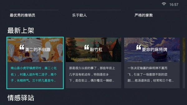 2、和传统的手机阅读相比,熊猫阅读TV版的视野更为开阔,能够清晰直观地看到具体的文章分类与内容列表,而且还具备有声阅读功能。
