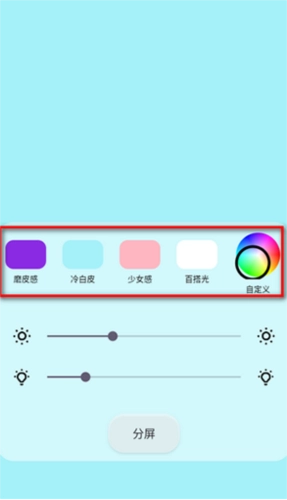 2、打开后可依据自身需求挑选背景颜色,选项包含磨皮感、冷白皮、少女感、百搭光以及自定义。