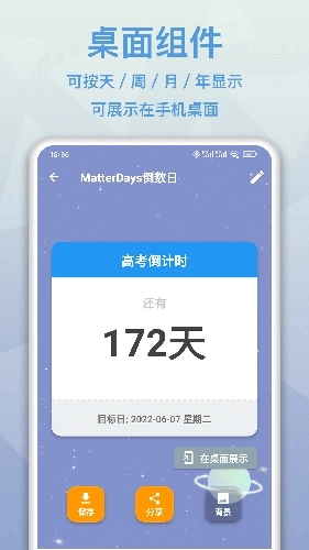 2、可显示正数已过去的天数与倒数剩余天数,支持农历日期显示,还能设置每年、每月、每周重复倒数的周期功能。