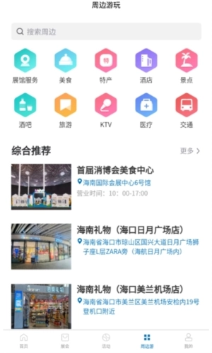 4、“消”遥游页面:展馆服务、美食、特产、酒店、景点、医疗、交通等各类信息;