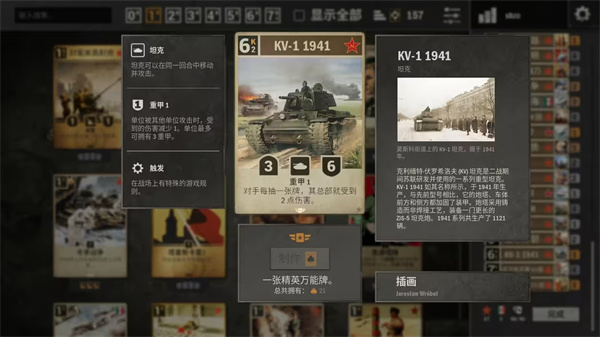 不得不说,这张卡无论是用于斩杀,还是单纯地打出以限制对手,效果都极为出色。特别是在对阵德国时,金KV堪称德国玩家的噩梦。首先,它拥有三点攻击力,不受“一日之狮”影响;其次,它具备一重甲和六滴血,“波哥”一炮都无法将其击杀。六费的消耗,更是让德国的消灭卡牌形同虚设,无疑是一张相当优秀的苏联金卡。并且,所有苏联卡组构筑都适合携带这张卡——我强烈建议新手优先合成它(在我个人看来,这张卡的优先级甚至比所谓的“微笑哥”还要高)。