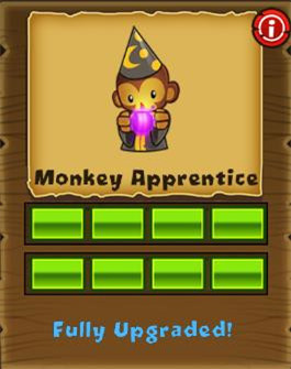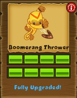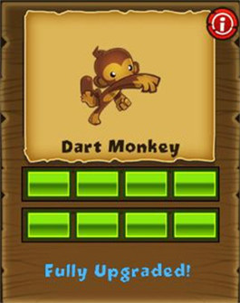 (提升射程)→(提升射程并且能够击中迷彩气球)→(射击速度降低但能够攻击18个气球)→(增强对陶瓷气球的攻击力,还能够攻击铁质气球)