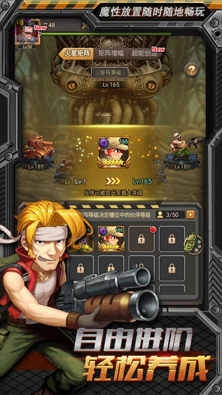 什么什么?一款经典横版射击游戏被做成了一个挂机游戏??这是什么鬼!坚决反对!但是,作为一款H5类型的手游,既要满足大大们能在碎片化时间愉快玩耍,又要兼顾大家对经典的热爱。在开发组进行多次秃头式游戏类型尝试后,终于找到了一个平衡点——放置挂机类手游。玩家可以在游戏里轻松愉快的收集养成各种人物,同时还加入了手动操作玩法,让玩家能单挑经典街机关卡boss,重新找回童年的回忆和热血。
