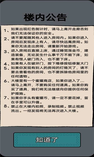 2、角色选择:玩家可以选择成为人类或猛鬼两大阵营之一。作为人类,玩家需要建立防御体系来抵御猛鬼的攻击;而作为猛鬼,玩家则需要寻找机会突破人类的防御,进攻宿舍。