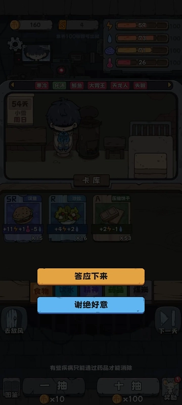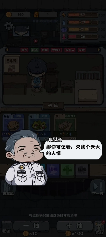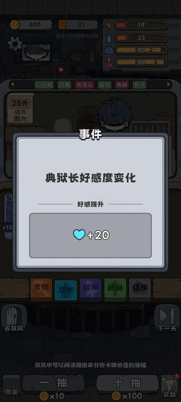 等到第20天,要是满足条件了,即拥有1张及以上SSR,或者煤炭数量达到20及以上,就去找典狱长借1000块钱。哼,要不是他最多只能借1000,我非得借到他破产不可。借到钱后就去抽卡(抽卡的时候可得留意精神状态,千万别把自己搞没了,每次抽卡会扣除10点精神,记得及时补充)。