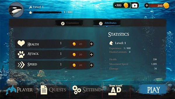 1. 消耗金币能够增添属性点,还能查看虎鲸的详尽数据,点击“play”即可开启游玩。