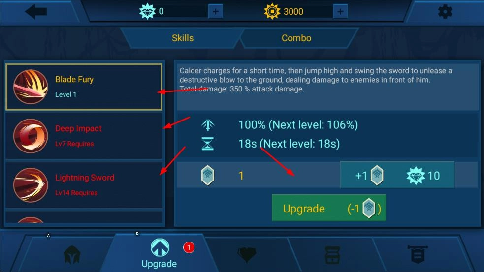 3、战斗结束后,可进入技能界面。在该界面中,对诸如Blade Fury等技能进行升级,以此提升伤害、缩短冷却时间等,进而强化自身战力,为后续战斗做好充分准备。