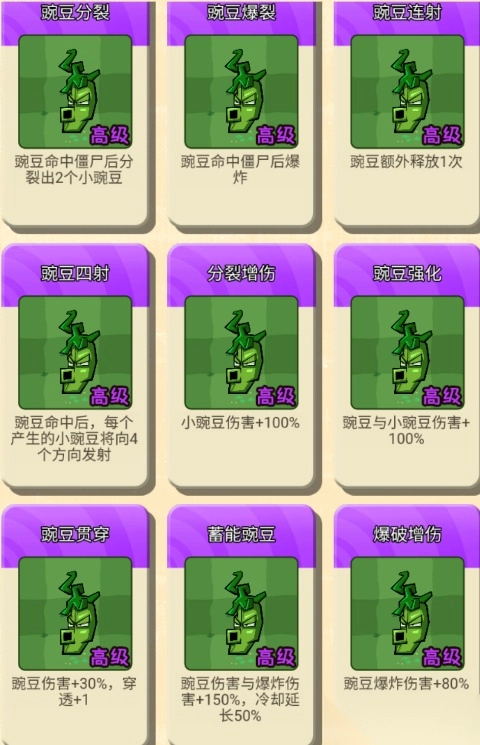 豌豆分裂效果:豌豆击中僵尸后会分裂出2个小豌豆;豌豆爆裂效果:豌豆击中僵尸后会发生爆炸。