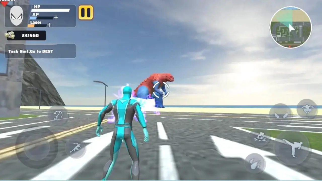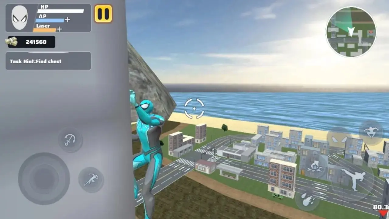 3、在游戏界面的左侧,设有摇杆,用于操控角色移动。在摇杆旁边,分布着一些按钮,这些按钮具备释放绳索以及加速的功能,能够有效提升角色的灵活性。