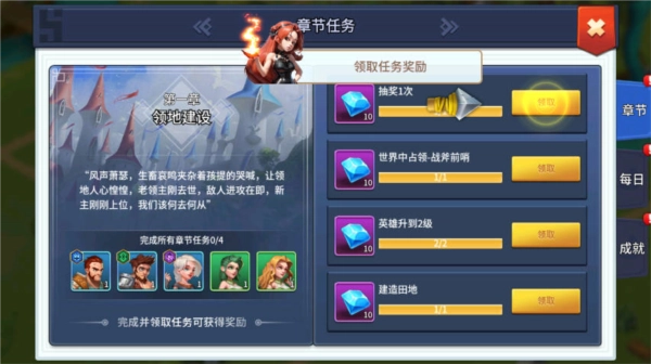 章节任务助力玩家前期开荒;每日任务每日刷新,完成后能够获取各类宝箱;成就任务作为长期目标,完成后会赠送大量道具。