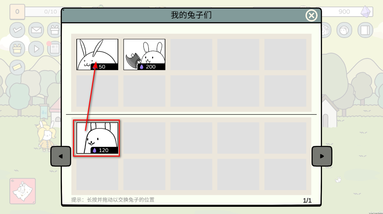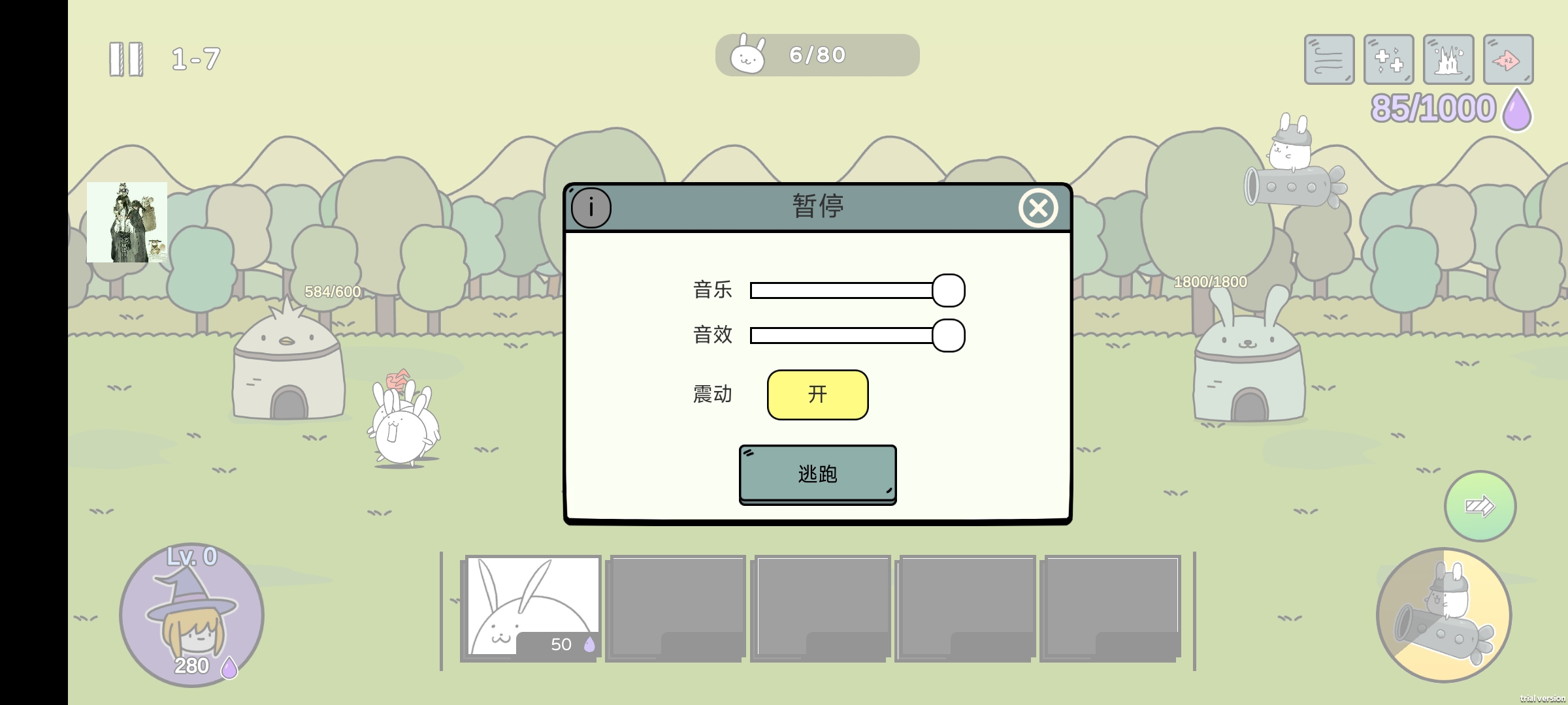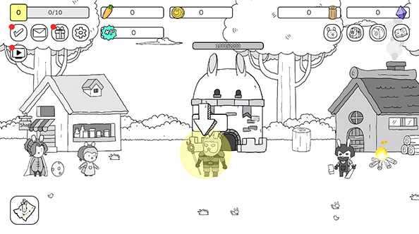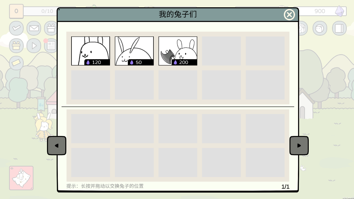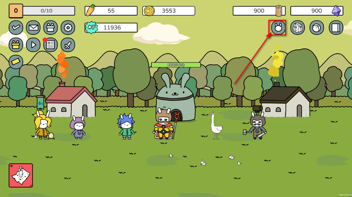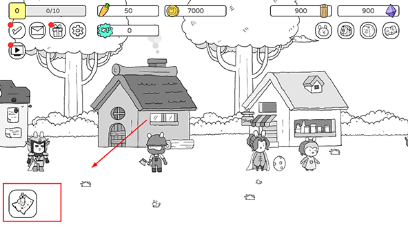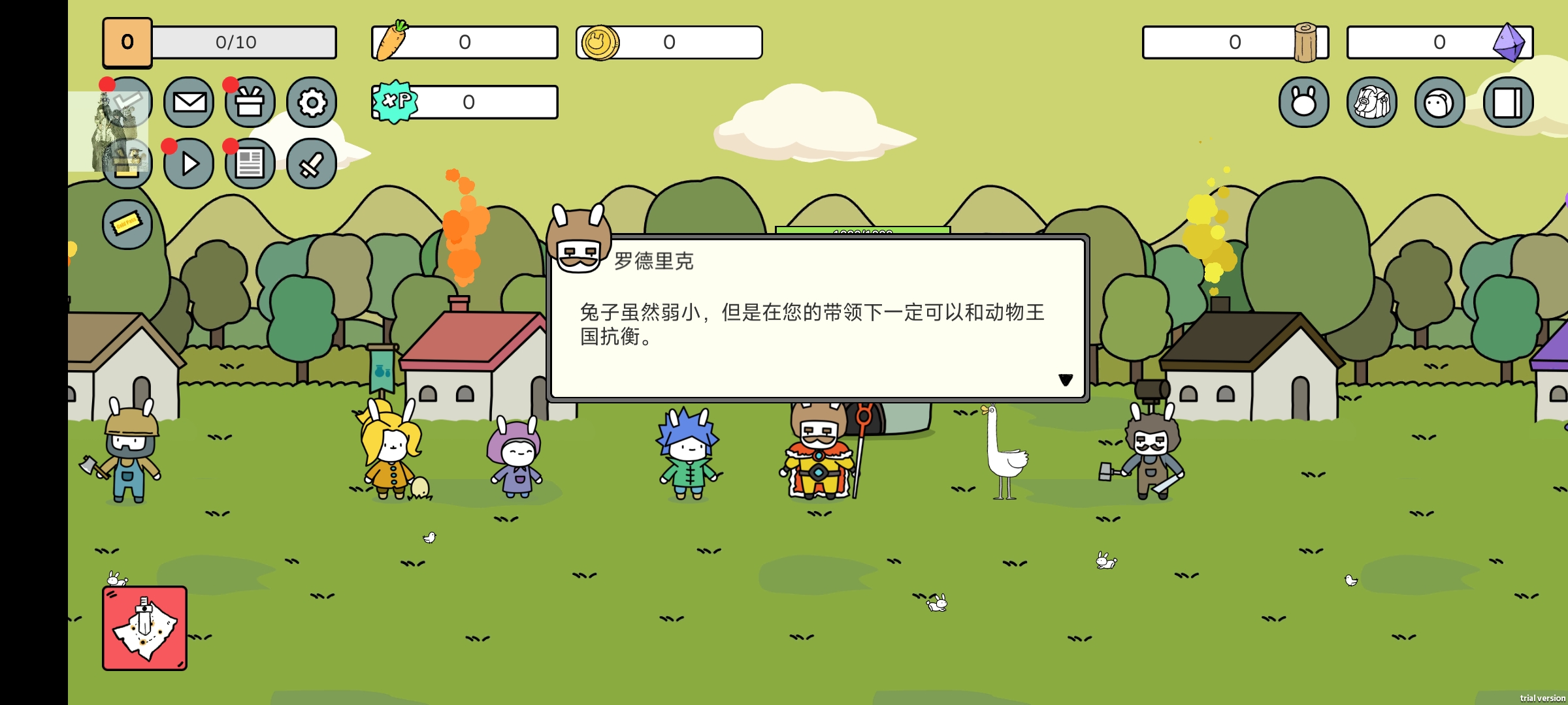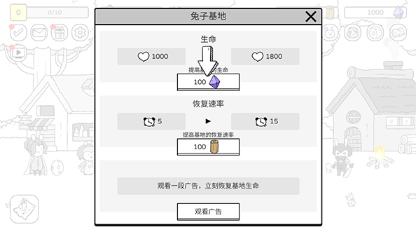 2、教程结束后,我们先回到最初那只兔子以及它左手边的兔子所在之处,为游戏闯关做好战前准备,升级基地并抽取战斗兔子。
