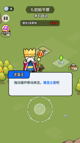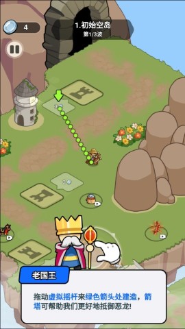 2. 通过拖动虚拟摇杆来确定建筑位置,选择在绿色箭头所指之处建造箭塔,以此增强防御效果。