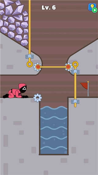 5、来到第六关,首先把中间的横杆打开,接着让上面的落石落下,使其堵住水池,如此便可顺利通过。