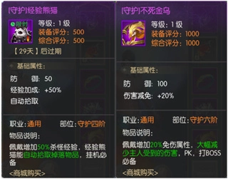 除普通装备外,还有额外守护装备,能为玩家增添打怪经验加成或减免伤害加成,堪称打怪升级与PK打boss的神器。