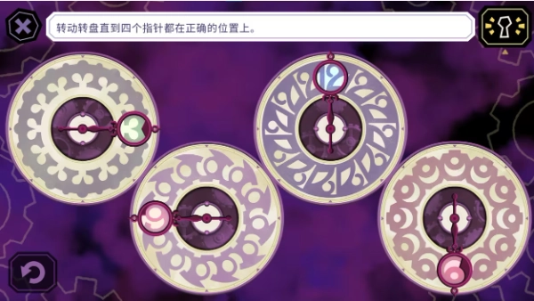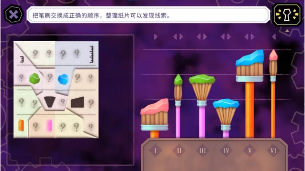 思路:把左边的拼图拼好,从上到下依次为:画笔高度、颜料颜色、画笔形状、笔杆颜色。 5、放大镜谜题