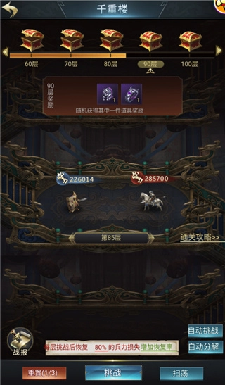 在游戏里,君主开启千重楼挑战有两种方式,一是在主城中点击“重楼试炼”,二是点击日常活动中的“千重楼”。每日能免费重置1次,使用[鲁班令]还可额外增加1次进入次数。千重楼每日最多可重置3次,次数用完后,当天就无法再进入了。