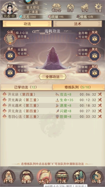 学习并修炼功法是最主要的属性获取方式,在聚灵阵中升级灵根可进一步加强功法效果。