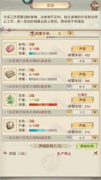 灵田中各设施都需要安排仆役进行劳作,其中兽场产出食物,其它设施的仆役都需要有足够的仆役方能进行劳作。当兽场食物产量和储量均不足时,灵田中的所有仆役将停止劳作。林场产出木材,药园产出灵草,矿脉产出玄铁。可通过升级队列提前安排灵田中各设施的升级情况。