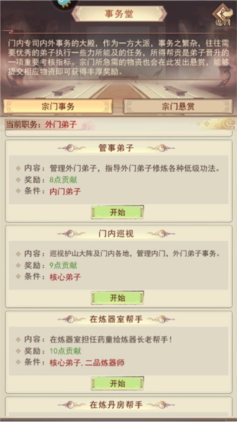 门派事务堂中可执行门派事务获得贡献,门派职务越高可执行的事务获得的门派贡献越多。门派每百年会发布宗门悬赏完成悬赏也可获得门派贡献。