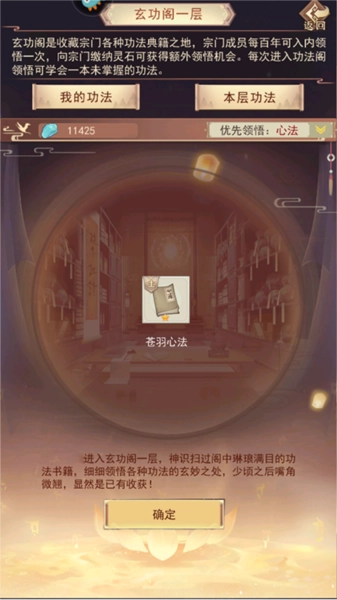 门派藏经阁中的玄功阁中可学习门派收藏的功法,门派职务越高,可进入的层数越多,学习的功法星级越高。可选择优先领悟某一类型的功法,但仍有可能领悟到其它类型的功法。