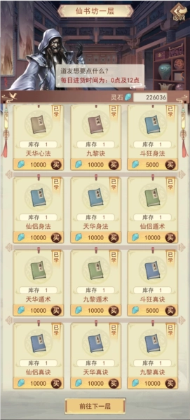 照阳,南紫,天海,神农:门派玄功阁三层(5000灵石1本)