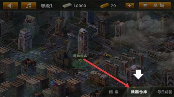 1. 于游戏主界面,点击武器仓库这一选项,随即进入武器管理界面,目的是为抵御僵尸而储备武器资源。