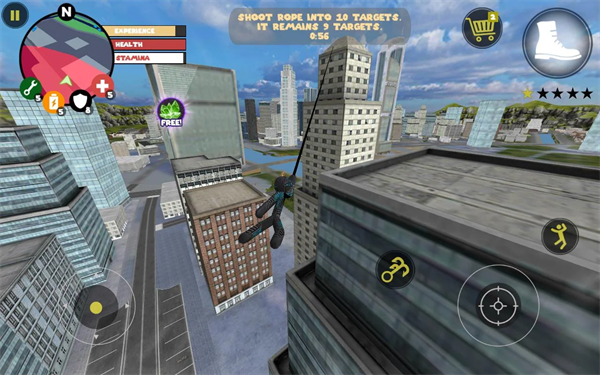 在操作方面,左侧控制移动与加速,右侧负责绳索操作、攻击(包含跳跃动作)以及单纯的跳跃功能。右上侧区域用于武器更换,同时,血量与经验的显示会实时更新,清晰明了。玩家可凭借自由的玩法,与其他帮派人物展开交火。在交火过程中,成功击杀敌人能获取经验,击杀数量增多会产生星级。一旦星级出现,警察以及周边其他角色会格外 “关照” 你,对你发起猛烈进攻。此时,如何生存下来并成功击杀其他人物,便成了你需要完成的任务。