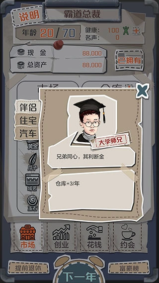 超真实又趣味满满的模拟经营游戏,堪称打发时间的绝佳利器。它模拟了现实创业人生的完整历程,从大学毕业初涉创业的辛酸,到创业途中、发展阶段,直至成功后的种种,代入感极强。随机的剧情与结局,为游戏增添了诸多挑战与无限可能。这款游戏短小精悍,一局仅需五分钟,能把漫长人生浓缩为一个个选择并精彩演绎。每个不同选择,都伴随着各异的经历,还会直接左右结局,恰似现实人生,未来充满变数,如何度过一生才能不留遗憾!