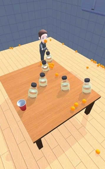 在桌子的一端,有个小个子正握着一个乒乓球准备投掷,可桌上的杯子摆放得实在太杂乱了。